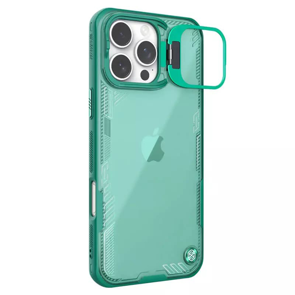 Pouzdro Nillkin Iceblade Prop se pyšní průhledným zeleným provedením, které nechá vyniknout ikonický design vašeho iPhonu 16 Pro, zatímco zelené okraje a rámeček fotoaparátu dodávají celku moderní a svěží vzhled. Zadní strana je navíc decentně zdobena jemnými geometrickými vzory, které přidávají na originalitě.