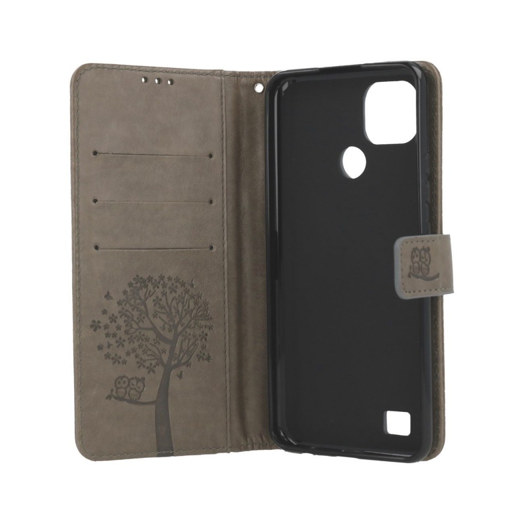 Knížkové pouzdro TopQ na mobil Realme C21 Šedý strom sovičkyTento knížkový obal, pyšnící se detailním motivem rozkvetlého stromu, poskytne Vašemu mobilu dokonalou ochranu před poškozením a díky svému provedení z něj udělá hravý doplněk.