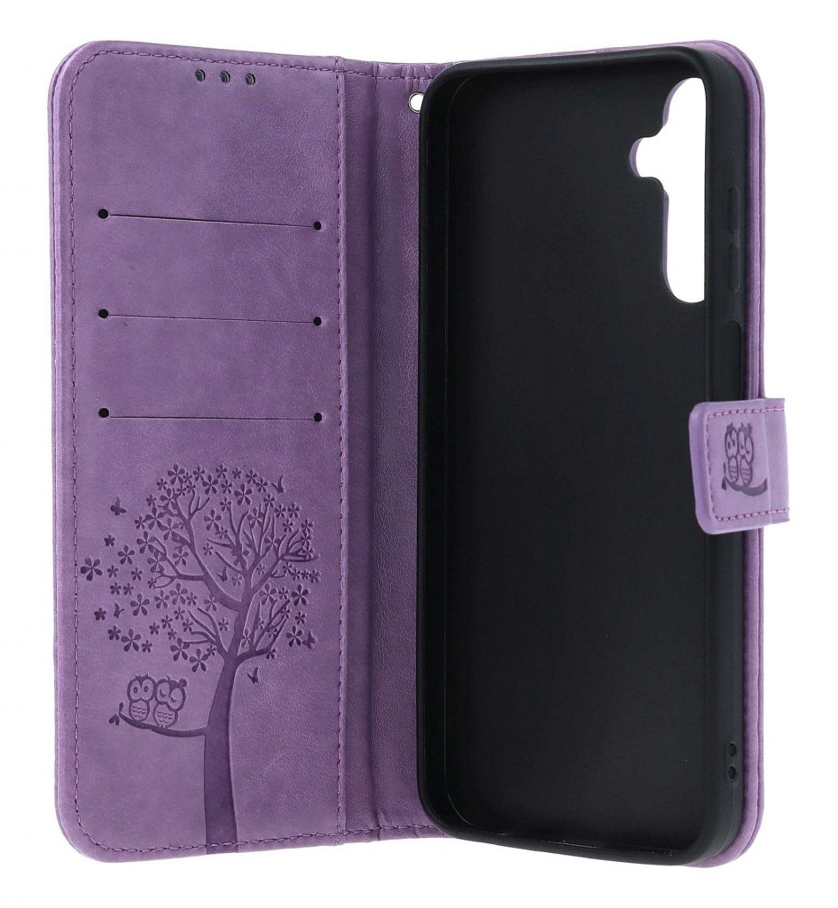 Knížkové pouzdro TopQ na mobil Samsung A15 Světle fialový strom sovičkyTento knížkový obal, pyšnící se detailním motivem rozkvetlého stromu, poskytne Vašemu mobilu dokonalou ochranu před poškozením a díky svému provedení z něj udělá hravý doplněk.