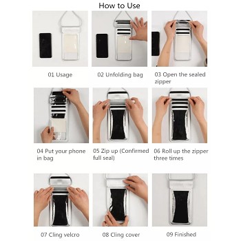 Zavírání je řešeno pomocí pokročilého zipového zapínání. Těsnící systém pojístíte ještě zapnutím pouzdra na suchý zip a Váš mobilní telefon bude bezpečně chráněn počas pobytu u vody.