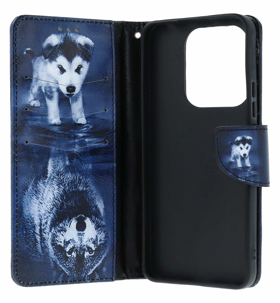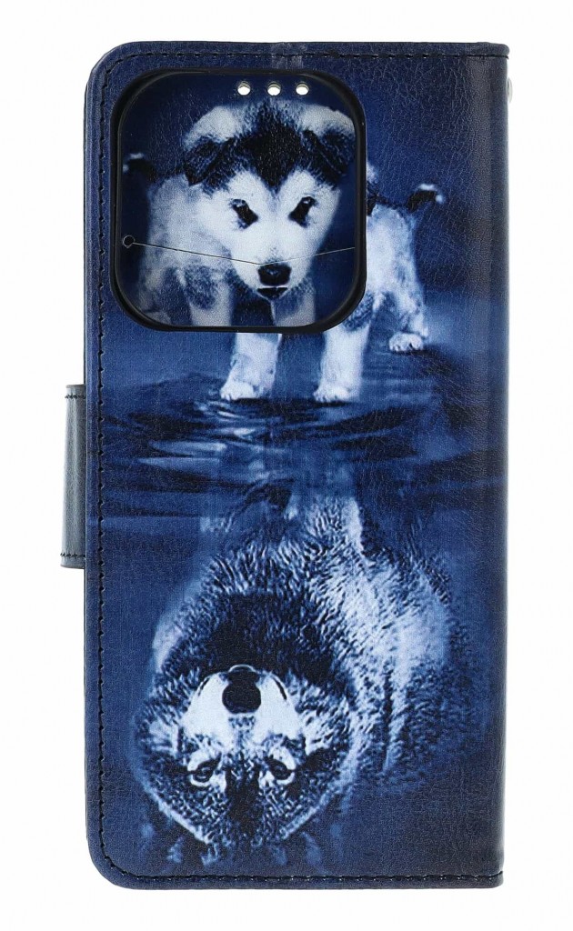 Přední straně pouzdra dominuje působivý a detailně zpracovaný motiv hlavy vlka, který se zrcadlí ve vodní hladině. Celá scéna je zasazena do tajemné, tmavé atmosféry nočního lesa, což dodává pouzdru na originalitě. Pouzdro je vyrobeno z kvalitní umělé kůže s precizním dvojitým prošíváním, které podtrhuje jeho odolnost. Vnitřní část je vybavena praktickými přihrádkami na karty a pružnou silikonovou vaničkou, která telefon pevně obepíná.