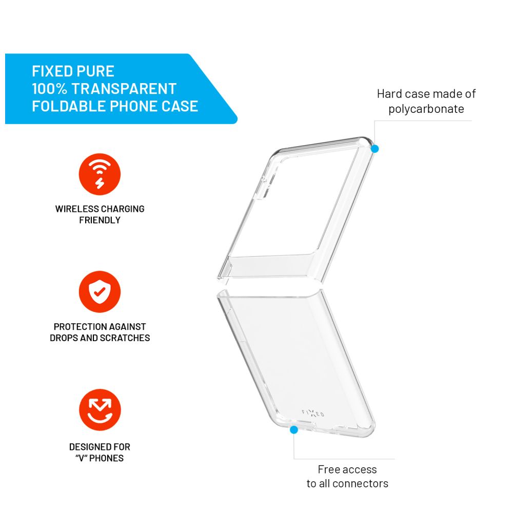 FIXED PURE představuje efektivní ochranu vyvinutou na míru vašeho vyklápěcího telefonu. Kryt z tvrzeného polykarbonátu perfektně přilne k tvaru telefonu, čímž umožňuje lehké sklopení obou částí přístroje a jejich úplného zavření. Telefon je tím zcela ochráněn nejen před nárazy a vniknutím nečistot, ale zabraňuje také opotřebení kloubu telefonu. Přesně tvarovaný kryt s výřezy pro fotoaparát, reproduktory i nabíjecí konektor zajišťuje bezproblémové používání, zároveň nebrání bezdrátovému nabíjení. UV úprava proti žloutnutí dodává krytu stále čirý vzhled a díky své 100% transparentnosti nezakrývá design telefonu. FIXED Pure je kompatibilní se všemi FIXED temperovanými skly.
