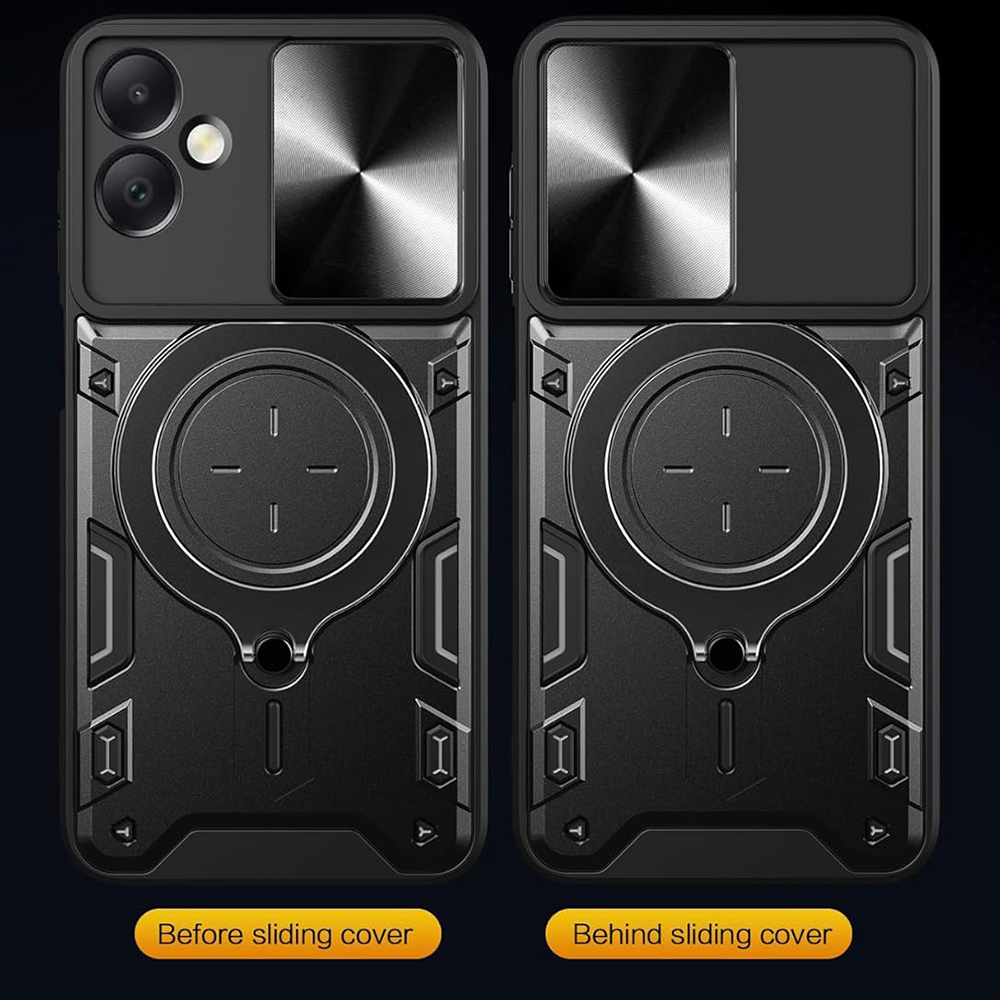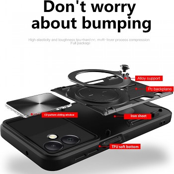Na zadní straně krytu naleznete praktický otočný kroužek, který slouží nejen jako bezpečný úchyt pro pohodlné držení telefonu, ale také jako stabilní stojánek pro horizontální i vertikální sledování obsahu. Díky integrované kovové destičce je kryt kompatibilní s magnetickými držáky do auta, což zvyšuje jeho praktičnost při cestování. Precizní výřezy zajišťují neomezený přístup ke všem konektorům, mikrofonům, reproduktorům a fotoaparátům, zatímco tlačítka si zachovávají jistý a příjemný stisk.