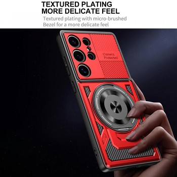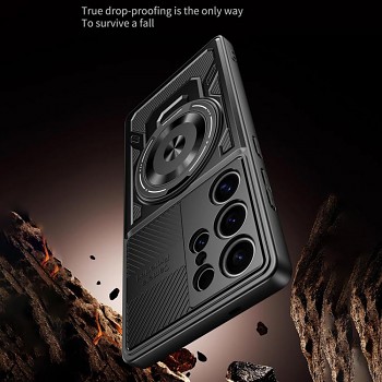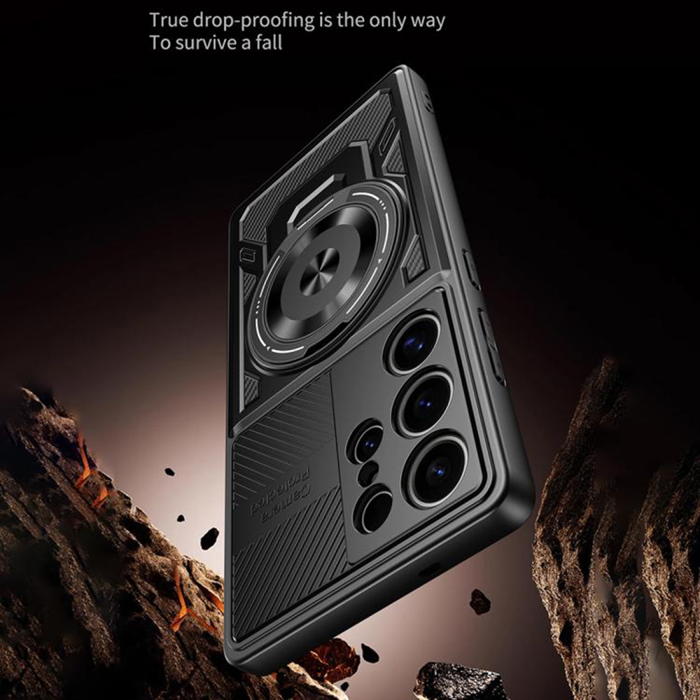 Odolný kryt Techsuit RuggedCam v černé barvě je navržen tak, aby poskytoval maximální ochranu a zároveň si zachoval moderní a funkční vzhled. Jeho robustní konstrukce kombinuje několik textur pro lepší úchop a estetiku. Na zadní straně dominuje posuvný kryt pro fotoaparát, který spolehlivě chrání čočky před poškrábáním a nečistotami, když nejsou používány. Spodní část zadní strany je opatřena elegantní texturou připomínající karbonové vlákno, zatímco horní část a boky mají drážkovaný povrch pro pevnější a jistější úchop. Integrovaný kovový kroužek na zadní straně slouží jako praktický stojánek pro sledování obsahu nebo jako bezpečný držák pro prst, a navíc je kompatibilní s magnetickými držáky do auta. Zvýšené okraje kolem displeje a fotoaparátu poskytují dodatečnou ochranu proti nárazům a pádům na rovné povrchy.