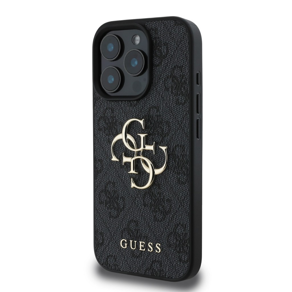 Prémiový zadní kryt Guess PU 4G Metal Logo se vyznačuje elegantním, charakteristickým 4G vzorem, doplněným o logo GUESS.