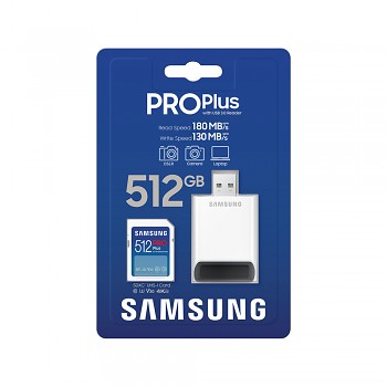 Paměťová karta Samsung PRO Plus SDXC 512GB + čtečkaRozšiřte své možnosti s paměťovou kartou Samsung PRO Plus SDXC 512GB, která je navržena pro profesionály i náročné uživatele. S touto kartou získáte extrémní rychlost a spolehlivost pro zachycení každého okamžiku ve špičkové kvalitě. Ideální pro záznam 4K UHD videa, dynamické sekvenční snímání a rychlý přenos objemných souborů. Součástí balení je i praktická čtečka karet pro okamžité použití.