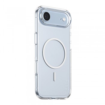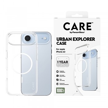 Kryt Urban Explorer se pyšní křišťálově čistým průhledným provedením, které nechá plně vyniknout originální design vašeho iPhone 17 Air. Jeho štíhlý profil a precizní zpracování zajišťují, že telefon zůstane lehký a pohodlný v ruce. Integrovaný bílý MagSafe kroužek na zadní straně nejenže dodává moderní estetiku, ale především zaručuje bezproblémovou kompatibilitu s veškerým MagSafe příslušenstvím. Zesílené rohy a vyvýšené okraje kolem displeje a fotoaparátu poskytují extra ochranu proti nárazům a poškrábání, zatímco diskrétní nápis "CARE" podtrhuje závazek značky k udržitelnosti a kvalitě.