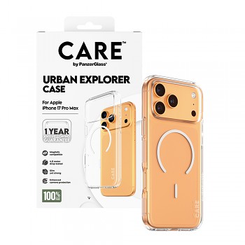 Kryt Urban Explorer se pyšní minimalistickým a zároveň vysoce funkčním designem. Jeho křišťálově čistá průhlednost nechá plně vyniknout originální barvu a elegantní linie vašeho iPhone 17 Pro. Integrovaný bílý kroužek MagSafe je nejen praktickým prvkem pro rychlé a přesné připojení příslušenství, ale zároveň dodává krytu moderní a sofistikovaný vzhled. Precizní výřezy zajišťují snadný přístup ke všem portům a tlačítkům, zatímco zvýšené okraje chrání displej a modul fotoaparátu před poškrábáním při položení na rovný povrch. Subtilní nápis "CARE by PanzerGlass®" decentně podtrhuje původ a kvalitu produktu.