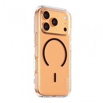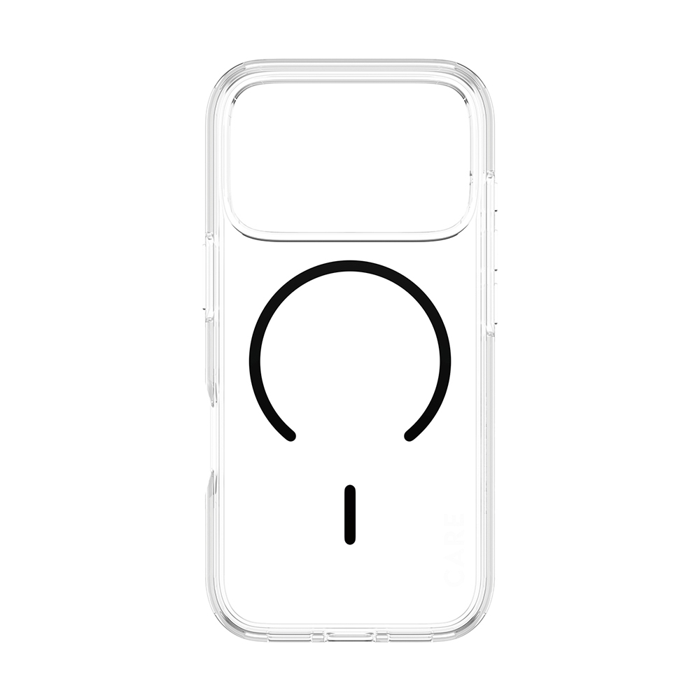 Design krytu je minimalistický a sofistikovaný. Díky své křišťálově čisté průhlednosti dokonale odhaluje barvu a linie vašeho iPhonu 17 Pro Max. Dominantním prvkem je integrovaný černý MagSafe kroužek, který zajišťuje bezproblémové a pevné připojení veškerého MagSafe příslušenství. Na zadní straně je decentně umístěn vertikální nápis "CARE" a logo "by PanzerGlass®", které podtrhují jeho prémiový původ a závazek k udržitelnosti.
