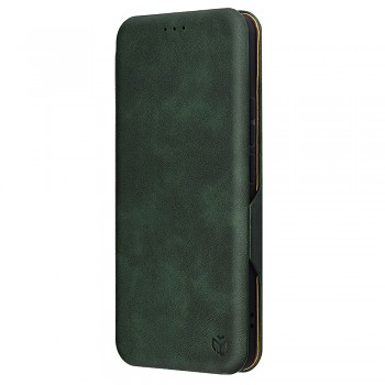 Pouzdro se pyšní sofistikovaným designem s tmavě zeleným povrchem, který imituje texturu broušené kůže, dodávající mu luxusní a zároveň odolný vzhled. Jeho matný finiš je příjemný na dotek a minimalizuje otisky prstů. Okraje pouzdra jsou elegantně lemovány kontrastním světle hnědým/zlatavým proužkem, který podtrhuje jeho prémiový charakter. Na přední straně najdete diskrétní embosované logo Techsuit a tři malé otvory pro reproduktor, zajišťující nerušené telefonování i se zavřeným pouzdrem. Zadní strana je precizně vybavena velkým kruhovým výřezem, který dokonale obepíná modul fotoaparátu s třemi objektivy a bleskem, čímž zajišťuje plnou funkčnost bez kompromisů. Jedná se o peněženkové pouzdro, které chrání telefon ze všech stran a zároveň nabízí prostor pro karty či bankovky.