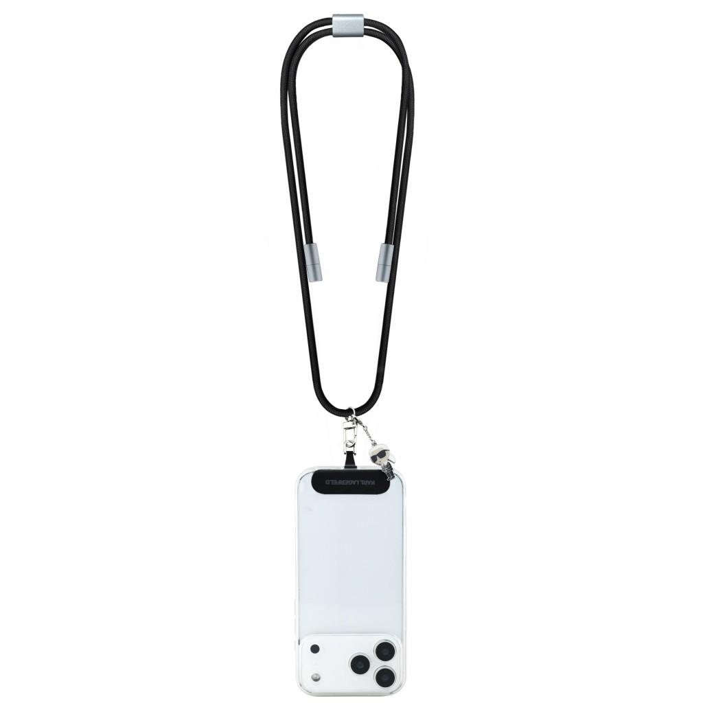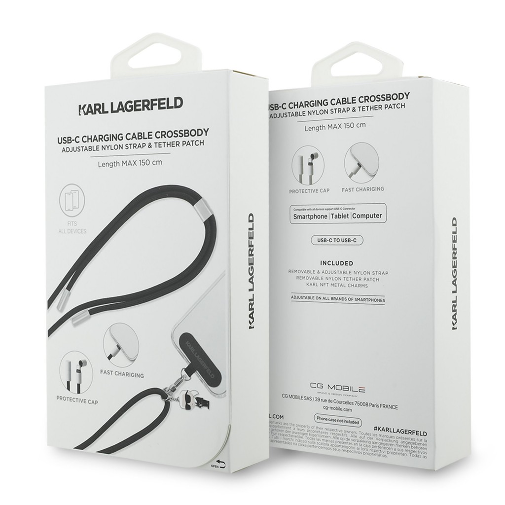 Popruh s kabelem Karl Lagerfeld Ikonik Charm USB-C/USB-C černýTento stylový doplněk zaujme svým kreativním provedením s nastavitelným popruhem a ochrannými krytkami konektorů proti prachu. Vyniká především multifunkčností, kdy popruh na krk slouží zároveň jako plnohodnotný nabíjecí kabel, ozdobený kovovým přívěskem Ikonik Charm.