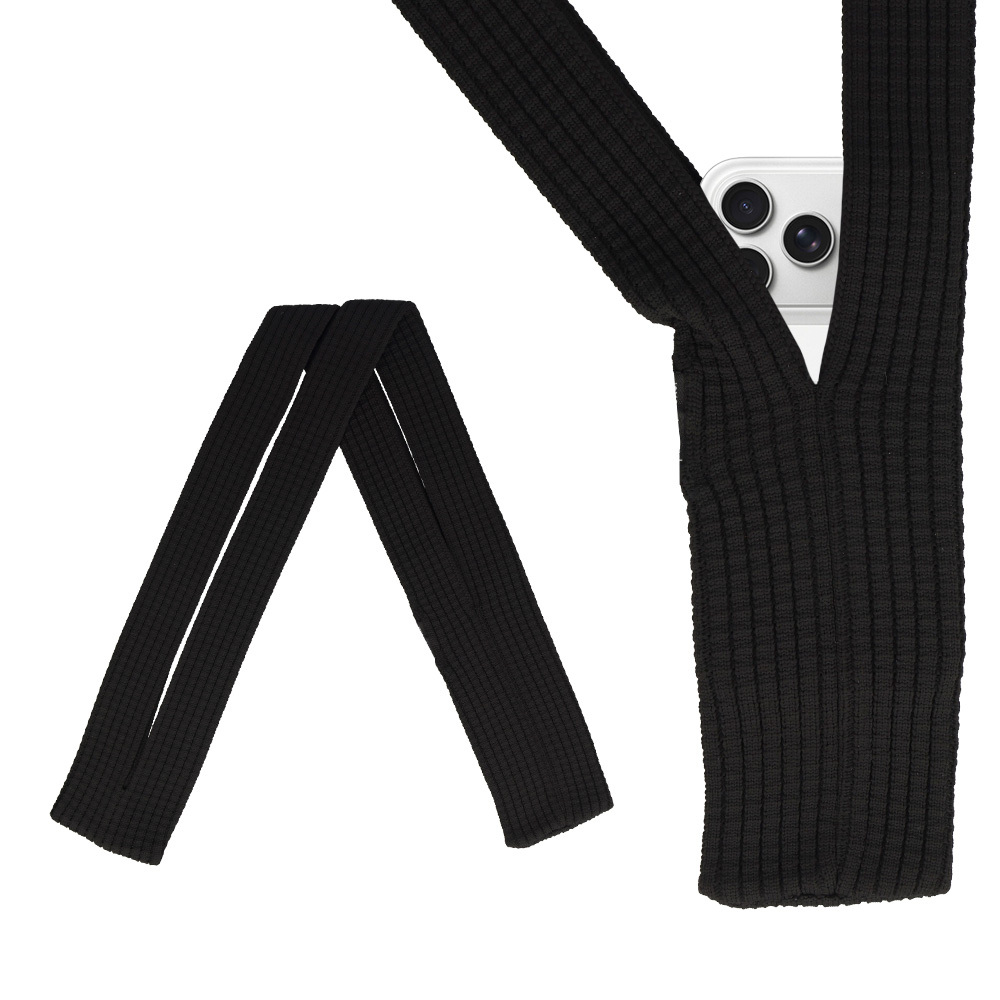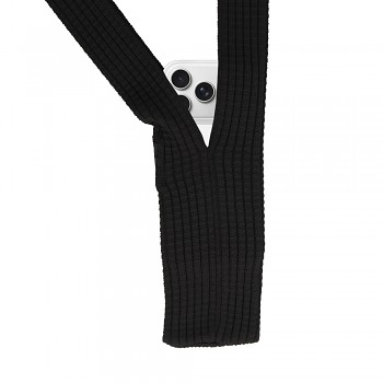 Tento popruh s kapsou se vyznačuje svým jednolitým a minimalistickým designem v elegantní černé barvě. Je vyroben technologií třívrstvého tkaní, která mu dodává jemnou texturu a zároveň zajišťuje vysokou odolnost a pružnost. Materiál plynule přechází z úzkého popruhu do rozšířené kapsy, která je navržena tak, aby se dokonale přizpůsobila tvaru vašeho telefonu a bezpečně ho držela. Celkový vzhled je velmi decentní a funkční, ideální pro každodenní nošení.