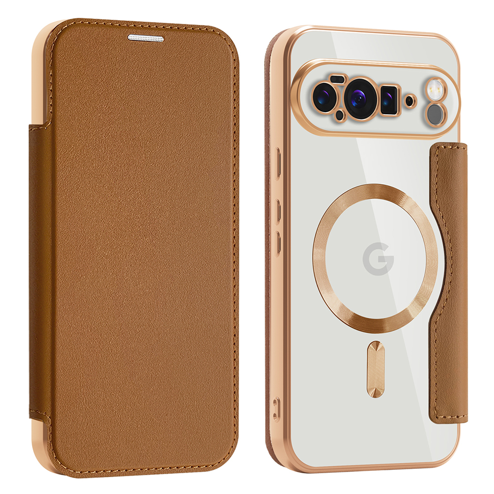 Pouzdro Techsuit SmartMag se pyšní luxusním hnědým provedením, které imituje kůži a dodává vašemu telefonu nadčasový vzhled. Jeho design ve stylu knihy zajišťuje komplexní ochranu před poškrábáním, nárazy a každodenním opotřebením. Vnitřní strana odklápěcího krytu je vybavena praktickými sloty na karty, které vám umožní mít vždy po ruce platební karty nebo doklady. Telefon je bezpečně usazen v průhledném vnitřním krytu s elegantními zlatavými/bronzovými akcenty kolem modulu fotoaparátu a výrazným magnetickým kroužkem s logem "G", což naznačuje kompatibilitu s magnetickým příslušenstvím a zároveň dodává pouzdru moderní nádech. Precizní výřezy pro konektory, mikrofony, reproduktory a fotoaparáty zajišťují neomezenou funkčnost vašeho telefonu, zatímco tlačítka si zachovávají jistý stisk.