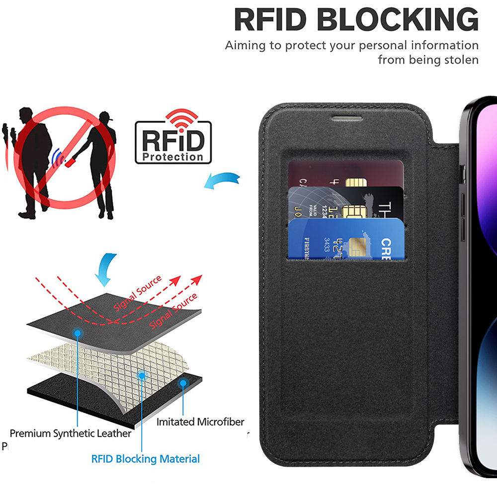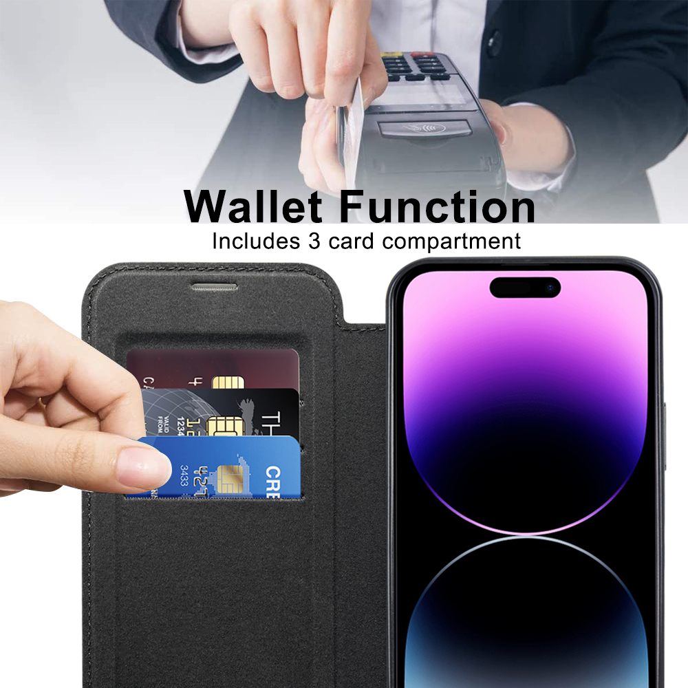 Pouzdro se pyšní promyšleným designem, který kombinuje praktičnost s moderním vzhledem. Vnější část je vyrobena z kvalitního materiálu v černé barvě, který připomíná kůži a dodává pouzdru luxusní nádech. Vnitřní strana předního flipu nabízí praktické sloty pro karty, což z něj činí ideálního společníka pro každodenní nošení. Telefon je bezpečně uchycen v průhledném zadním krytu s černým rámečkem, který nechává vyniknout originální barvu vašeho zařízení a logo Apple. Integrovaný MagSafe kroužek na zadní straně zajišťuje kompatibilitu s MagSafe příslušenstvím a bezdrátovým nabíjením. Přesné výřezy pro konektory, mikrofony, reproduktory a fotoaparáty zaručují neomezenou funkčnost telefonu, zatímco tlačítka mají jistý stisk pro pohodlné ovládání.