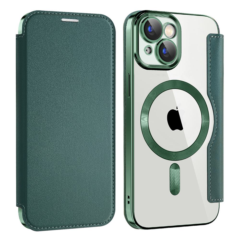 Toto pouzdro se pyšní sofistikovaným designem, který dokonale doplňuje váš iPhone 15 Plus. Vnější strana je vyrobena z prémiové syntetické kůže v sytě zeleném odstínu, zatímco vnitřní část je potažena imitovaným mikrovláknem, které chrání displej před poškrábáním. Telefon je pevně usazen v průhledné vaničce s elektroplátovanými zelenými rámečky, které zvýrazňují elegantní linie zařízení a zároveň poskytují dodatečnou ochranu.