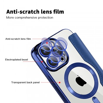 Pouzdro Techsuit SmartMag se pyšní sofistikovaným designem, který kombinuje praktičnost s moderním vzhledem. Vnější strana pouzdra je vyrobena z odolného materiálu s jemnou texturou v sytě modré barvě, která dodává pouzdru luxusní vzhled a příjemný pocit na dotek. Vnitřní strana flipu nabízí praktické sloty pro platební karty nebo doklady, což z něj činí ideálního společníka pro každodenní nošení. Zadní část pouzdra, která obepíná telefon, je průhledná a umožňuje tak vyniknout originálnímu designu vašeho iPhonu. Okraje pouzdra a oblast kolem fotoaparátu jsou zvýrazněny lesklým modrým rámečkem, který dokonale ladí s barvou flipu a zároveň poskytuje zvýšenou ochranu citlivých částí telefonu. Integrovaný MagSafe kroužek zajišťuje kompatibilitu s bezdrátovým nabíjením a dalším MagSafe příslušenstvím, což podtrhuje jeho moderní a funkční charakter.