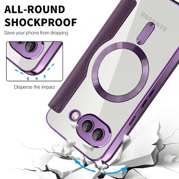 Telefon je bezpečně usazen v průhledném zadním krytu, který nechává vyniknout originální design vašeho zařízení. Kryt je doplněn fialovými akcenty kolem modulu fotoaparátu a výrazným kruhovým magnetickým prvkem, který naznačuje kompatibilitu s magnetickým příslušenstvím. Boční strany držáku telefonu jsou rovněž v elegantní fialové barvě, dokonale ladící s celkovým barevným schématem. Přesné výřezy pro konektory, mikrofony, reproduktory a fotoaparáty zajišťují, že funkčnost vašeho telefonu nebude nikdy omezena. Tlačítka mají jistý stisk a přístup k nabíjecímu portu je vždy bezproblémový.