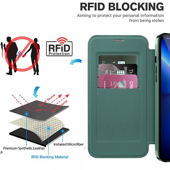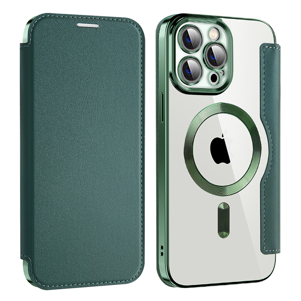 Pouzdro se pyšní sofistikovaným designem typu "kniha", který poskytuje komplexní ochranu pro celý telefon. Vnější strana je vyrobena z materiálu s jemnou texturou v sytě zeleném odstínu, který působí luxusně a příjemně na dotek. Precizní prošívání po okrajích dodává pouzdru prémiový vzhled a zvyšuje jeho odolnost. Vnitřní strana přední klapky je vybavena praktickými přihrádkami na karty, což z něj činí ideálního společníka pro každodenní nošení. Telefon je bezpečně uchycen v průhledné vaničce, která nechává vyniknout originální design a barvu vašeho iPhone 13 Pro Max. Na zadní straně vaničky je integrován magnetický kruh pro MagSafe příslušenství, zajišťující snadné a pevné uchycení.