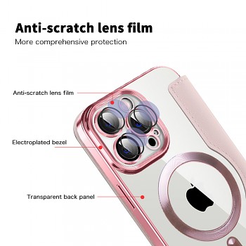 Pouzdro Techsuit SmartMag se pyšní prémiovou syntetickou kůží na vnější straně, která mu dodává luxusní vzhled a příjemný pocit na dotek. Vnitřní strana je opatřena imitovaným mikrovláknem, jež chrání displej vašeho telefonu před poškrábáním. Růžová barva pouzdra je doplněna elektrolyticky pokoveným rámečkem kolem fotoaparátu a hran telefonu, což vytváří harmonický a elegantní celek. Zadní strana pouzdra, která objímá telefon, je průhledná a umožňuje tak vyniknout originálnímu designu vašeho iPhone 13 Pro.