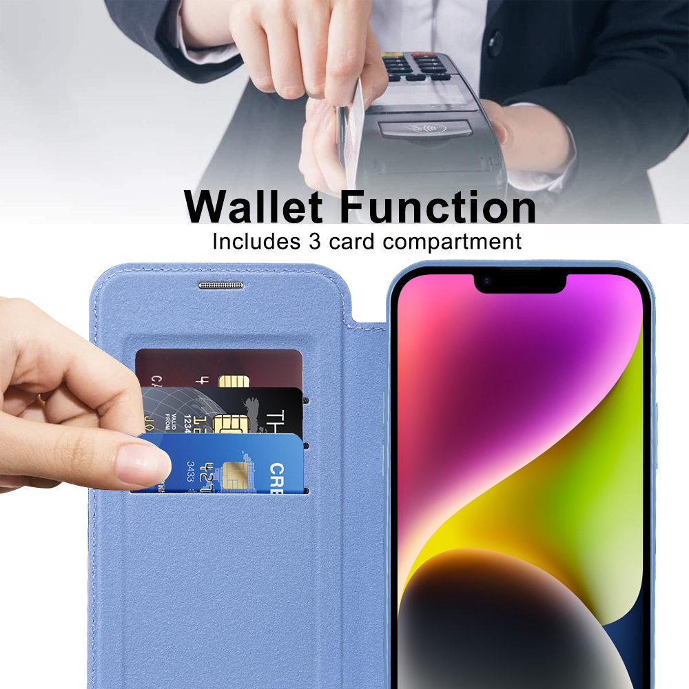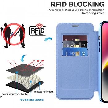 Uvnitř pouzdra naleznete tři praktické přihrádky na karty, které vám umožní mít důležité doklady a platební karty vždy po ruce. Pro vaši bezpečnost je pouzdro vybaveno technologií RFID blokování, která chrání vaše osobní údaje před zneužitím. Telefon je pevně uchycen v průhledném zadním krytu s precizně zpracovaným galvanizovaným rámečkem v ladící světle modré barvě. Tento kryt navíc disponuje ochrannou fólií na čočky fotoaparátu, která zajišťuje komplexní ochranu proti poškrábání. Integrovaný magnetický kroužek zajišťuje kompatibilitu s MagSafe příslušenstvím, což umožňuje snadné a rychlé bezdrátové nabíjení.