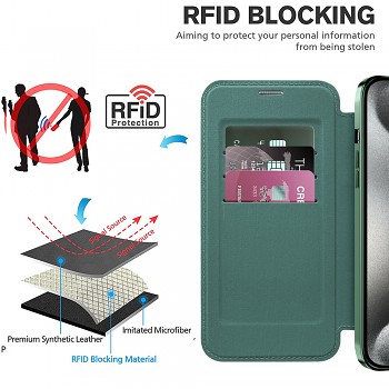Pouzdro se pyšní sofistikovaným designem typu kniha, který chrání telefon ze všech stran. Vnější strana je vyrobena z kvalitního materiálu s jemnou texturou, připomínající kůži, což zajišťuje příjemný pocit na dotek a pevný úchop. Vnitřní strana předního flipu nabízí praktické sloty pro platební karty nebo doklady, což z pouzdra činí multifunkčního společníka pro každý den. Zadní část pouzdra, do které se telefon vkládá, je průhledná, což umožňuje vyniknout originálnímu designu vašeho iPhone 15 Pro. Je doplněna o výrazný zelený kroužek kompatibilní s technologií MagSafe a zelené akcenty kolem modulu fotoaparátu, které dokonale ladí s celkovým barevným provedením pouzdra. Precizní výřezy pro konektory, mikrofony, reproduktory a fotoaparáty zajišťují neomezenou funkčnost telefonu a tlačítka mají jistý stisk.