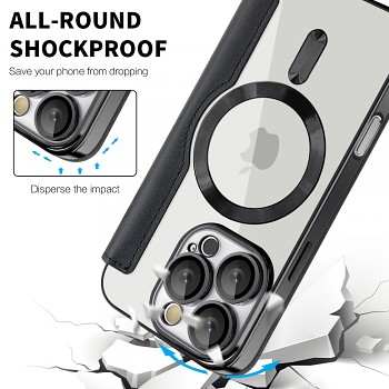 Váš telefon je bezpečně uložen v transparentní zadní části pouzdra, která nechává vyniknout originální design telefonu. Integrovaný výkonný magnetický kruh zajišťuje plnou kompatibilitu s technologií MagSafe, což umožňuje snadné a rychlé bezdrátové nabíjení a připojení MagSafe příslušenství. Pouzdro poskytuje komplexní ochranu proti nárazům díky svému celoobvodovému designu, který efektivně rozptyluje energii při pádu. Zvláštní pozornost byla věnována ochraně fotoaparátu – pouzdro disponuje anti-scratch fólií na čočky a galvanizovaným rámečkem kolem modulu fotoaparátu, což chrání objektivy před poškrábáním a poškozením.