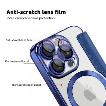 Pouzdro Techsuit SmartMag se pyšní sofistikovaným designem, který podtrhuje krásu vašeho iPhone 16 Pro. Zadní strana pouzdra je transparentní, což umožňuje vyniknout originální barvě a designu vašeho telefonu. Okolo modulu fotoaparátu a MagSafe kroužku jsou elegantní modré galvanizované rámečky, které dodávají pouzdru moderní a luxusní vzhled. Přední odklápěcí část je vyrobena z prémiové syntetické kůže v sytě modré barvě a uvnitř skrývá praktické přihrádky na karty. Celé pouzdro je vybaveno silným magnetickým jádrem, které zajišťuje bezpečné uzavření a plnou kompatibilitu s MagSafe příslušenstvím a bezdrátovým nabíjením.