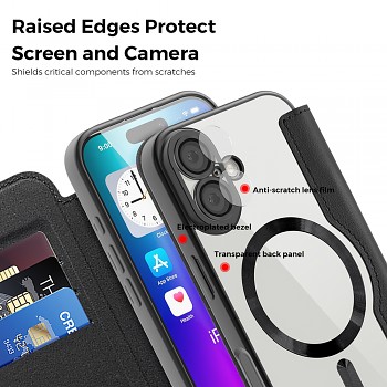 Pouzdro Techsuit SmartMag se pyšní luxusním vzhledem díky svému zpracování z pečlivě vybrané PU kůže v hnědém odstínu, která je příjemná na dotek a zajišťuje dlouhou životnost. Vnitřní strana pouzdra nabízí praktické sloty pro platební karty a hotovost, což z něj činí ideálního společníka na cesty a pro ty, kteří chtějí mít vše důležité po ruce. Telefon je usazen v transparentní zadní části, která nechává vyniknout originální design vašeho iPhone 17. Zlaté elektroplatované rámečky kolem fotoaparátu a po obvodu pouzdra dodávají celku punc elegance a zároveň zajišťují zvýšenou ochranu. Zvýšené okraje navíc chrání displej a čočky fotoaparátu před poškrábáním a nárazy. Pouzdro je plně kompatibilní s MagSafe příslušenstvím díky integrovanému magnetickému kroužku, který zajišťuje silné a stabilní připojení.