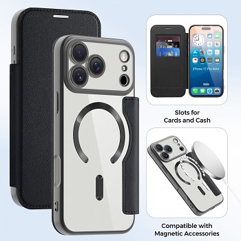 Pouzdro Techsuit SmartMag v elegantní černé barvě kombinuje sofistikovaný vzhled s maximální praktičností. Váš iPhone 17 Pro je bezpečně uložen v průhledné vaničce s robustním černým rámečkem, která nechává vyniknout originální design telefonu a zároveň poskytuje spolehlivou ochranu proti nárazům a poškrábání. Přední odklápěcí část pouzdra, inspirovaná designem knihy, je vyrobena z kvalitní černé texturované umělé kůže a nabízí praktické sloty pro platební karty či vizitky, což z něj činí ideálního společníka pro každodenní použití. Integrovaný MagSafe kroužek na zadní straně zajišťuje bezproblémovou kompatibilitu s MagSafe příslušenstvím, což podtrhuje moderní a funkční charakter pouzdra.