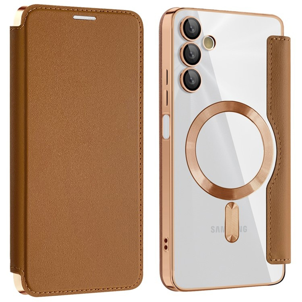 Pouzdro Techsuit SmartMag se pyšní elegantním knižním designem v teplém hnědém odstínu, který dodává vašemu zařízení nádech luxusu. Vnější část je vyrobena z prémiové syntetické kůže, zatímco vnitřní strana je potažena imitací mikrovlákna pro maximální ochranu displeje. Vnitřní vanička, do které se telefon vkládá, je průhledná a nechává vyniknout originální barvu vašeho telefonu. Její okraje a detaily kolem fotoaparátu jsou zvýrazněny galvanicky pokoveným rámečkem v elegantní měděné barvě, což dodává pouzdru moderní a luxusní vzhled.
