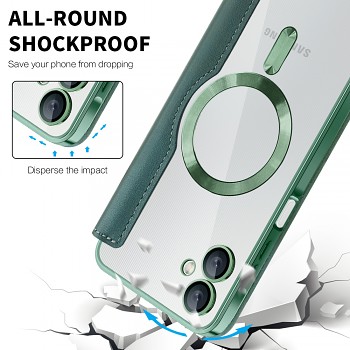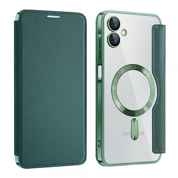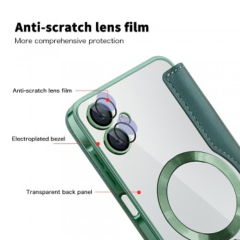 Pouzdro Techsuit SmartMag se pyšní sofistikovaným designem v hlubokém zeleném odstínu, který dodá vašemu telefonu nádech elegance. Jedná se o praktické pouzdro typu "kniha" s odklápěcí přední stranou, která chrání displej vašeho zařízení před poškrábáním a nárazy. Uvnitř odklápěcí části naleznete praktické sloty pro platební karty či doklady, což z něj činí ideálního společníka pro každodenní nošení. Telefon je bezpečně usazen v průhledné vaničce s elegantními zelenými okraji, která nechává vyniknout originální design vašeho Samsung Galaxy A06. Na zadní straně vaničky je integrován výrazný magnetický kruh, který zajišťuje kompatibilitu s MagSafe příslušenstvím a dalšími magnetickými držáky, což podtrhuje název "SmartMag" a přidává pouzdru na univerzálnosti a modernosti. Precizní zpracování zahrnuje přesné výřezy pro konektory, mikrofony, reproduktory i fotoaparáty, zajišťující plnou funkčnost telefonu bez omezení. Tlačítka mají jistý stisk a přístup k nabíjecímu portu je vždy bezproblémový.
