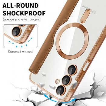 Pouzdro Techsuit SmartMag se pyšní luxusním vzhledem díky svému provedení z prémiové syntetické kůže v hnědém odstínu. Vnitřní část, která objímá telefon, je průhledná, což nechá vyniknout originální design vašeho zařízení. Okraje pouzdra a výřezy pro fotoaparáty jsou zvýrazněny elegantním galvanizovaným rámečkem v barvě růžového zlata, který dodává pouzdru punc exkluzivity.
