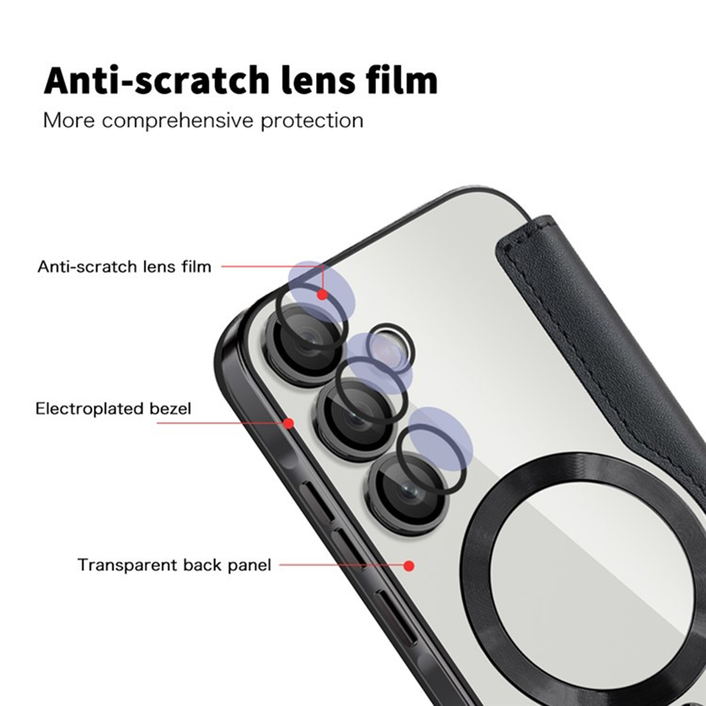 Design pouzdra je promyšlený do posledního detailu. Vnější strana je vyrobena z kvalitního materiálu s jemnou texturou, která připomíná kůži, což zajišťuje příjemný pocit na dotek a zároveň odolnost proti poškrábání a opotřebení. Vnitřní strana flipu nabízí praktické sloty pro platební karty nebo vizitky, což z pouzdra činí ideálního společníka pro každodenní nošení. Telefon je bezpečně usazen v průhledné vaničce, která nechává vyniknout jeho originální design a zároveň poskytuje spolehlivou ochranu zadní strany a boků. Pouzdro je vybaveno magnetickým zavíráním, které zajišťuje pevné a bezpečné uzavření, chrání displej před poškozením a zabraňuje nechtěnému otevření. Precizní výřezy pro fotoaparát, konektory a reproduktory jsou samozřejmostí, stejně jako přesně tvarovaná tlačítka pro snadné ovládání.