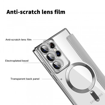Pouzdro se pyšní sofistikovaným designem v nadčasové šedé barvě, která podtrhuje eleganci vašeho telefonu. Jeho provedení typu "kniha" chrání displej i zadní stranu zařízení. Vnitřní strana přední klopy je vybavena praktickými sloty na karty, které vám umožní mít vždy po ruce ty nejdůležitější doklady nebo platební karty. Zadní část pouzdra je průhledná, což nechává vyniknout originální design vašeho telefonu, a je doplněna o integrovaný magnetický kroužek a menší vertikální magnetický proužek, které zajišťují kompatibilitu s magnetickými doplňky a bezpečné uchycení. Přesné výřezy pro fotoaparáty, konektory a tlačítka zaručují plnou funkčnost bez jakéhokoli omezení.