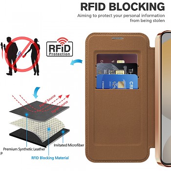Pouzdro Techsuit SmartMag se pyšní promyšleným designem, který kombinuje praktičnost s moderním vzhledem. Vnější část je vyrobena z kvalitního materiálu imitujícího kůži v teplém hnědém odstínu, který je příjemný na dotek a dodává pouzdru luxusní vzhled. Přední odklápěcí kryt chrání displej telefonu a zároveň slouží jako praktická peněženka, neboť obsahuje vnitřní přihrádky pro uložení platebních karet nebo dokladů.