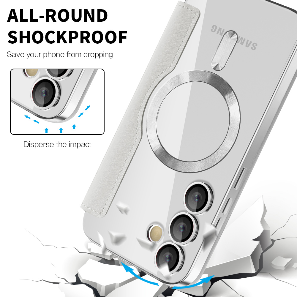 Pouzdro Techsuit SmartMag se pyšní minimalistickým a sofistikovaným designem. Vnější strana je vyrobena z kvalitního materiálu s jemnou texturou v neutrální šedé barvě, která dodává vašemu telefonu elegantní vzhled. Vnitřní strana předního flipu je vybavena třemi praktickými sloty na karty, ideálními pro uložení platebních karet, občanského průkazu nebo vizitek. Telefon je bezpečně uchycen v průhledném silikonovém pouzdře, které zachovává původní design a barvu vašeho zařízení. Integrovaný magnetický kroužek a vertikální magnetický proužek zajišťují pevné a spolehlivé uzavření pouzdra a zároveň umožňují kompatibilitu s magnetickými doplňky. Přesné výřezy pro fotoaparáty, konektory a reproduktory zaručují plnou funkčnost telefonu bez omezení.