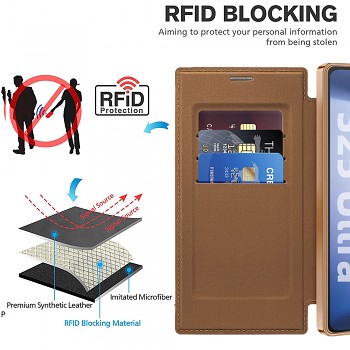Pouzdro se pyšní klasickým knižním designem, který poskytuje komplexní ochranu celému vašemu zařízení. Vnější strana je vyrobena z kvalitního materiálu v teplém hnědém odstínu, který dodává pouzdru luxusní vzhled. Vnitřní strana přední klopy je vybavena praktickými sloty pro platební karty nebo doklady, což z něj činí ideálního společníka pro každodenní nošení.