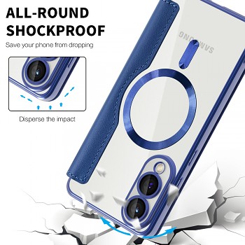 Zadní část pouzdra je transparentní, což umožňuje vyniknout originálnímu designu vašeho Samsung Galaxy S25 Edge. Okraje a oblast kolem fotoaparátu jsou zvýrazněny modrým galvanizovaným rámečkem, který nejenže dodává pouzdru moderní vzhled, ale také poskytuje dodatečnou ochranu. Integrovaný výkonný magnetický kruh zajišťuje kompatibilitu s bezdrátovým nabíjením a MagSafe příslušenstvím, což vám umožní pohodlně nabíjet telefon bez nutnosti vyjímání z pouzdra. Samozřejmostí je komplexní ochrana fotoaparátu díky speciální anti-scratch fólii na čočkách.