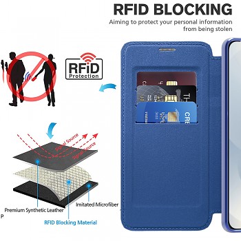Pouzdro se pyšní sofistikovaným designem typu kniha v sytě modrém odstínu, který dodává vašemu zařízení nádech elegance. Vnější strana je vyrobena z prémiové syntetické kůže s jemnou texturou, která je příjemná na dotek a zároveň odolná proti každodennímu opotřebení. Vnitřní strana přední klopy nabízí praktické sloty pro platební karty a větší kapsu, což z něj činí ideálního společníka pro ty, kteří chtějí mít vše důležité po ruce. Pro maximální bezpečnost vašich osobních údajů je klopa vybavena RFID blokovací technologií, která chrání vaše karty před neoprávněným skenováním.
