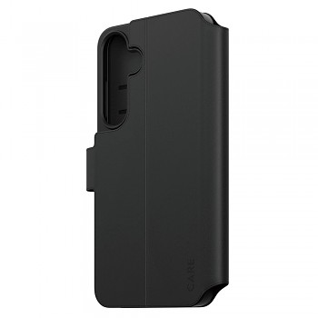 Pouzdro se pyšní elegantním folio designem, který obepíná váš telefon ze všech stran a poskytuje mu komplexní ochranu. Jeho povrch je vyveden v matné černé barvě s jemnou texturou, která je příjemná na dotek a zároveň minimalizuje otisky prstů. Precizní výřezy zajišťují snadný přístup ke všem portům, tlačítkům a fotoaparátu, aniž byste museli telefon z pouzdra vyjímat. Diskrétní nápis „CARE“ na přední straně podtrhuje závazek značky k udržitelnosti a péči o životní prostředí. Integrovaná funkce Kickstand umožňuje pohodlné sledování obsahu v horizontální poloze, zatímco Wallet provedení nabízí praktické přihrádky pro karty nebo bankovky, čímž efektivně nahrazuje peněženku.