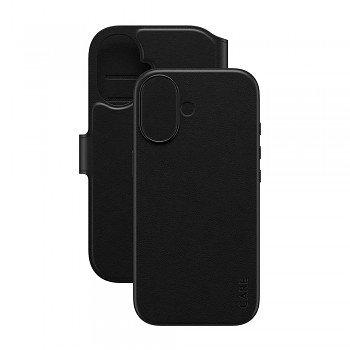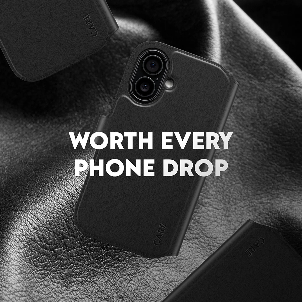 Pouzdro Tango Two-in-One Wallet se vyznačuje sofistikovaným a praktickým designem. Jedná se o dvoudílné řešení, které kombinuje robustní zadní kryt s odnímatelnou peněženkou. Zadní kryt, který je na první pohled viditelný, má matný, jemně texturovaný povrch v černé barvě, který je příjemný na dotek a minimalizuje otisky prstů. Přesně kopíruje linie telefonu a poskytuje zvýšenou ochranu pro modul fotoaparátu, který je elegantně zapuštěn a chráněn. Na spodní části zadního krytu je decentně vyraženo slovo "CARE", zdůrazňující závazek značky k udržitelnosti a péči.