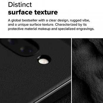 Pouzdro Ringke Onyx se pyšní moderním broušeným designem a výraznou povrchovou texturou, která nejen skvěle vypadá, ale také zajišťuje pevný a jistý úchop. Jeho matný černý povrch dodává telefonu prémiový vzhled a minimalizuje otisky prstů. Přesné výřezy pro fotoaparát a porty zaručují plnou funkčnost, zatímco zvýšené okraje chrání displej a čočky fotoaparátu před poškrábáním při položení na rovný povrch. Díky své konstrukci splňuje pouzdro vojenské standardy odolnosti MIL-STD 810G-516.6, což zaručuje vynikající ochranu proti pádům a nárazům.