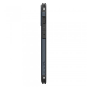 Pouzdro Spigen Tough Armor MagSafe se pyšní robustní dvouvrstvou konstrukcí, která kombinuje pružný TPU materiál s pevným polykarbonátovým pláštěm. Vnější strana v barvě kovové břidlice je doplněna o černé akcenty na rozích a kolem výřezu pro fotoaparát, což dodává pouzdru dynamický a odolný vzhled. Vnitřní vrstva v kontrastní žluté barvě je navržena pro efektivní absorpci nárazů a rozložení energie při pádu. Integrovaný výklopný stojánek na zadní straně umožňuje pohodlné sledování obsahu v horizontální poloze. Přesné výřezy pro porty a responzivní tlačítka zajišťují snadný přístup a ovládání. Díky integrovanému MagSafe kroužku je pouzdro plně kompatibilní s veškerým MagSafe příslušenstvím, což zaručuje pevné a spolehlivé připojení.