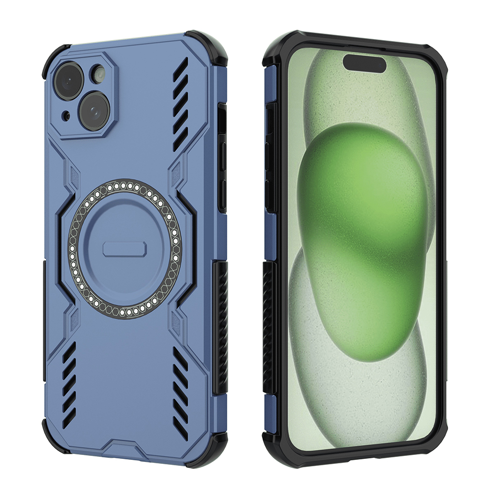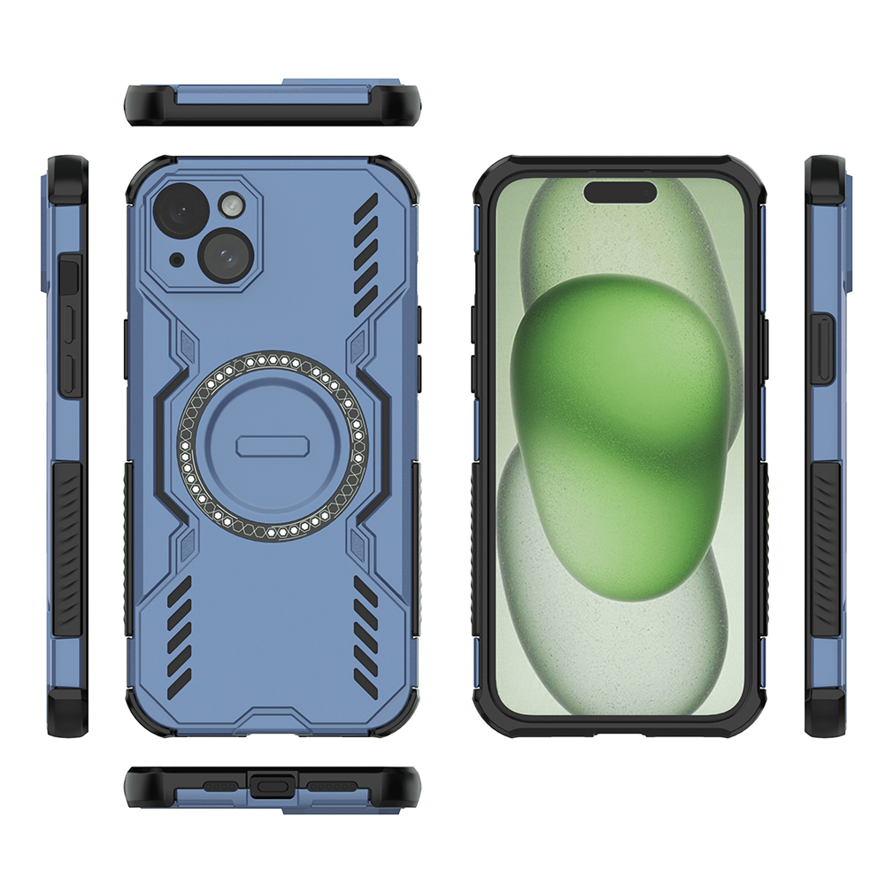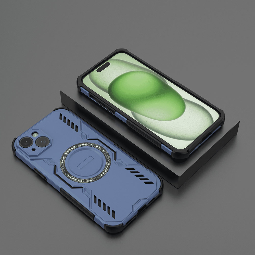 Pouzdro Techsuit ArmorMag se pyšní robustním a moderním designem, který okamžitě upoutá pozornost. Jeho dominantní modrá barva je doplněna o kontrastní černé akcenty na okrajích a kolem modulu fotoaparátu, což dodává pouzdru dynamický vzhled. Zadní strana je opatřena geometrickými, téměř pancéřovými vzory, které nejen skvěle vypadají, ale také přispívají k lepšímu úchopu.