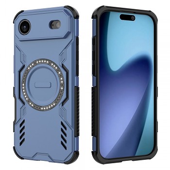 Toto pouzdro se vyznačuje vícevrstvou konstrukcí, která poskytuje špičkovou ochranu proti nárazům a pádům. Dominantou zadní strany je výrazný modrý povrch s moderními geometrickými prvky a diagonálními liniemi, které dodávají pouzdru dynamický a odolný vzhled. Uprostřed se nachází integrovaný magnetický kroužek, obklopený dekorativním prstencem s drobnými tečkami, zajišťující kompatibilitu s MagSafe příslušenstvím a bezproblémové bezdrátové nabíjení. Černé akcenty na rozích a bocích pouzdra nejen podtrhují jeho robustní charakter, ale zároveň zvyšují odolnost proti nárazům. Zvýšené okraje kolem displeje a fotoaparátu poskytují dodatečnou ochranu před poškrábáním při položení na rovný povrch. Boční strany jsou opatřeny texturovanými prvky pro jistější úchop a tlačítka jsou precizně zpracovaná pro snadný a citlivý stisk.