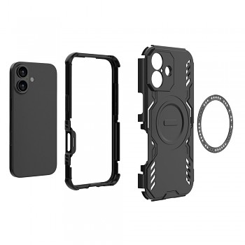 Na zadní straně pouzdra naleznete integrovaný magnetický kroužek, který je kompatibilní s technologií MagSafe, což umožňuje snadné a bezpečné připevnění MagSafe příslušenství. Tento kroužek je navíc elegantně orámován dekorativním tečkovaným vzorem. Pro ochranu citlivého fotoaparátu jsou kolem objektivů zvýšené okraje, stejně tak jako zvýšené okraje na přední straně pouzdra chrání displej před poškrábáním a nárazy. Pouzdro je navrženo jako vícevrstvé, pravděpodobně kombinující tvrdou vnější skořepinu s měkčí vnitřní vrstvou pro efektivní absorpci nárazů.