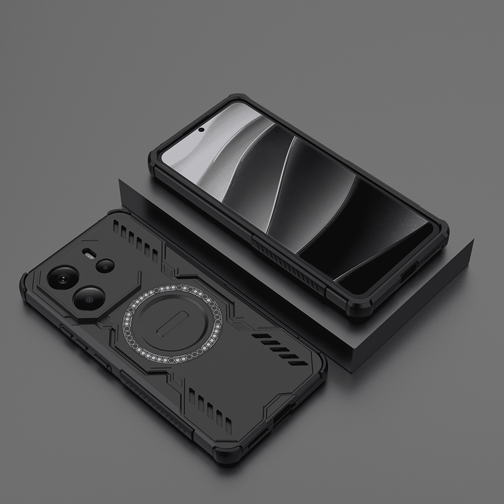 Pouzdro Techsuit ArmorMag se pyšní moderním a odolným designem v černé barvě, který podtrhuje robustnost a připravenost na jakékoli dobrodružství. Jeho povrch je opatřen texturovanými prvky, které nejenže dodávají pouzdru dynamický vzhled, ale také zlepšují úchop a minimalizují riziko vyklouznutí z ruky. Zesílené rohy absorbují nárazy a rozkládají energii při pádu, čímž chrání nejzranitelnější části vašeho telefonu. Integrovaný magnetický kroužek na zadní straně je nejen praktickým prvkem pro MagSafe příslušenství, ale také elegantním designovým detailem, který doplňuje celkový vzhled pouzdra.