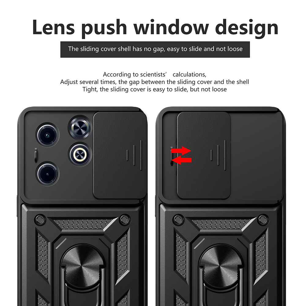 Na zadní straně pouzdra naleznete integrovaný kovový kroužek (Ring stand), který slouží jako praktický stojánek pro pohodlné sledování obsahu a zároveň jako bezpečný úchyt pro lepší manipulaci s telefonem. Kroužek je navíc vybaven magnetickou kovovou destičkou (Magnetic iron sheet), což umožňuje snadné a stabilní připevnění telefonu k magnetickým držákům v autě. Celkový design je doplněn robustními texturami a detaily, které pouzdru dodávají taktický vzhled a zvyšují jeho odolnost proti pádům, splňující standard MIL STD 810G-516.6.