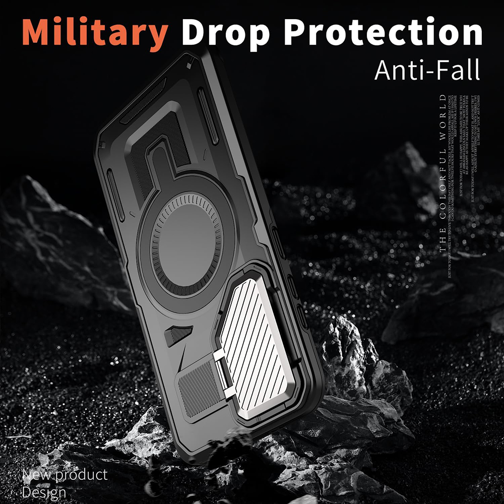 Toto robustní pouzdro se pyšní moderním a odolným designem v elegantní černé barvě. Jeho konstrukce je navržena pro maximální ochranu, s výraznými detaily, které podtrhují jeho pevnost. Dominantou zadní strany je inovativní posuvný kryt fotoaparátu s texturovaným povrchem, který spolehlivě chrání objektivy před poškrábáním a nečistotami, když je nepoužíváte. Uprostřed zadní části naleznete integrovaný magnetický kroužek MagSafe, který zajišťuje pevné a stabilní připojení k MagSafe příslušenství, jako jsou nabíječky nebo držáky. Pro ještě větší pohodlí je pouzdro vybaveno výklopným stojánkem, který umožňuje snadné sledování obsahu v horizontální poloze. Všechny výřezy pro konektory, mikrofony a reproduktory jsou precizně zpracované, stejně jako tlačítka, která si zachovávají jistý stisk.