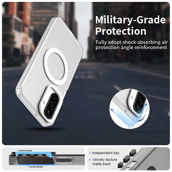 Pouzdro Techsuit CandyCase MagSafe se pyšní minimalistickým a vysoce kvalitním designem. Je vyrobeno z odolného, transparentního materiálu, který nechá vyniknout originální vzhled vašeho Samsungu Galaxy A26 5G. Klíčovým prvkem je integrovaný bílý MagSafe kroužek na zadní straně, který zajišťuje silnou a spolehlivou magnetickou adhezi. Díky tomu je pouzdro plně kompatibilní s bezdrátovým nabíjením a MagSafe příslušenstvím, jako jsou nabíjecí peněženky.